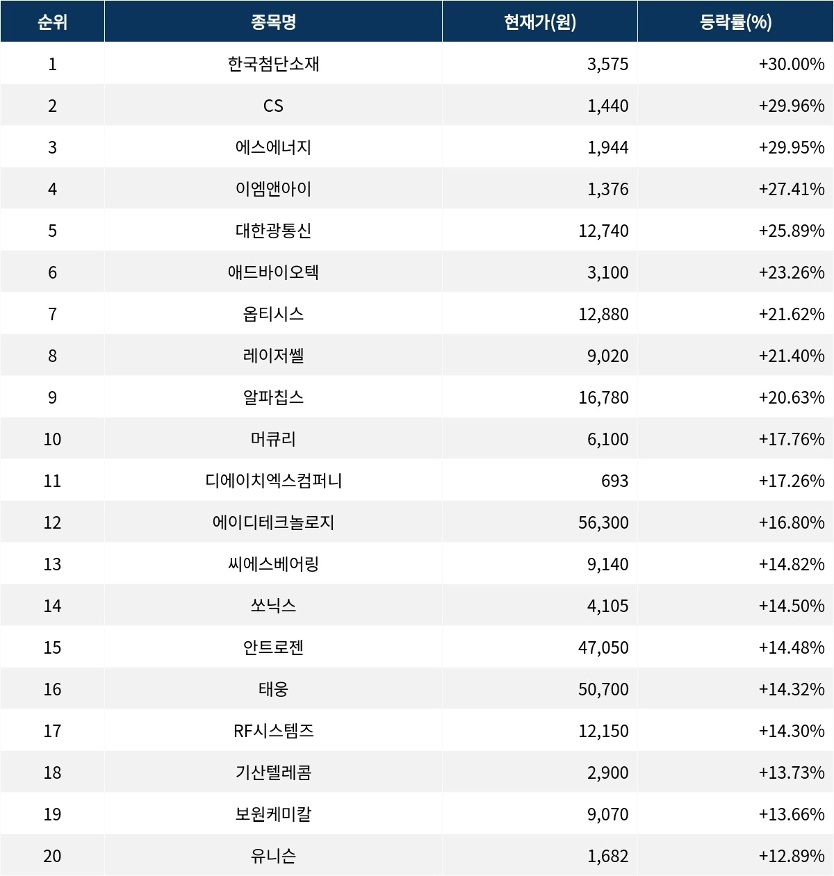 이어 상승률 2위 CS(065770)는 주가가 29.96% 상승하며 종가 1440원에 상승 마감했다. 상승률 3위 에스에너지(095910)의 주가는 1944원으로 29.95% 상승하며 호조를 보였다. 상승률 4위 이엠앤아이(083470)는 27.41% 상승하며 1376원에 마감했다. 상승률 5위 대한광통신(010170)은 25.89%의 상승세를 타고 1만 2740원에 마감했다.