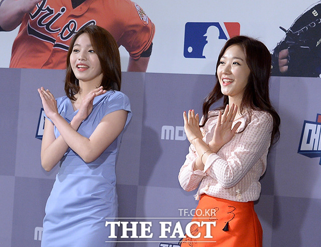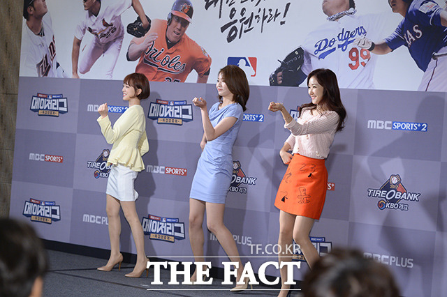정새미나와 엄윤주, 장예인 아나운서(왼쪽부터)가 28일 오후 서울 종로구 포시즌스호텔에서 열린 MBC스포츠플러스 2017 시즌 야구 기자 간담회에 참석해 춤을 추고 있다.