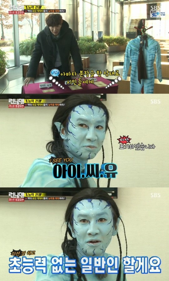 제작진이 “아바타 분장을 한 상태로 시민들에게..”라고 미션을 설명하자 이광수는 제작진의 말을 끊고 “야”라고 소리쳐 웃음을 자아냈다.