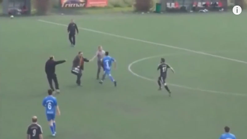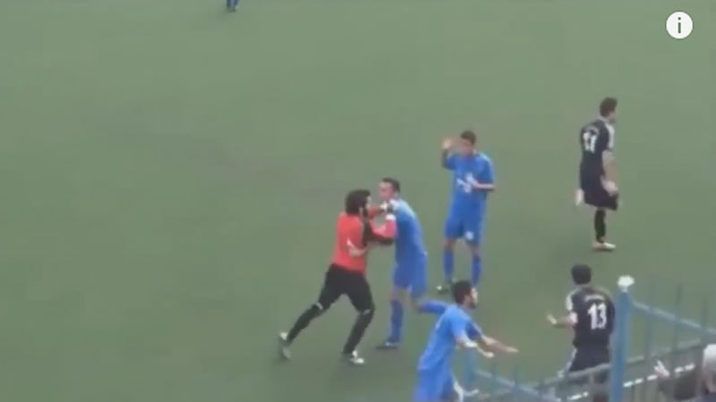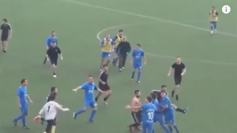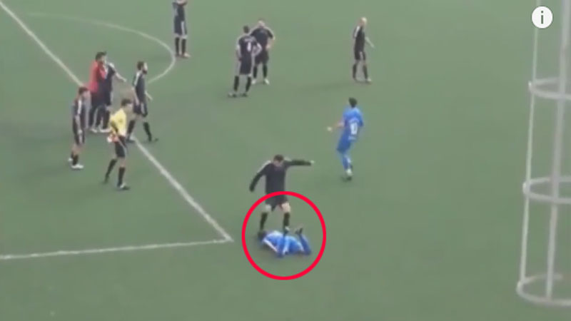 폭력은 여기서 끝나지 않았다. 경기장에 엎드려 있는 선수를 또 다른 선수가 킥으로 얼굴을 걷어찬다. 피해 팀 동료 선수들이 이에 격분해 달려들자 패싸움이 시작된다. 축구장은 어느새 서로 발차기를 해대는 난장판으로 변한다.