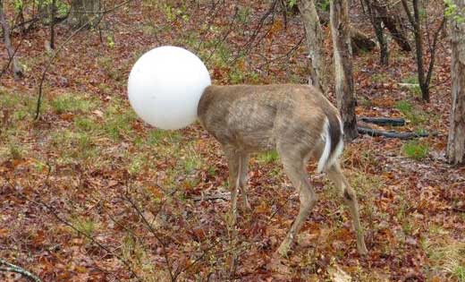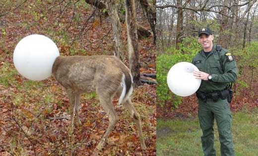 지난해 5월 5일(현지시간) 미국 뉴욕 CBS 뉴스 등 주요 언론들은 3일 뉴욕주 롱아일랜드의 한 숲에서 원형 가로등 유리를 머리에 쓴 사슴이 구조요청을 받고 출동한 경찰에 의해 구조됐다고 보도했다.