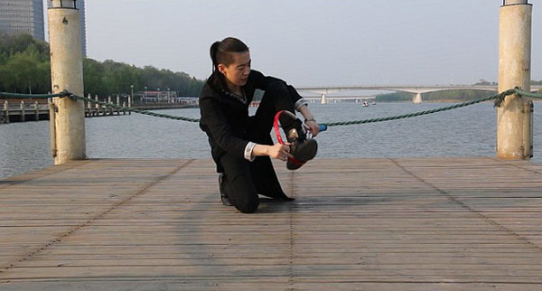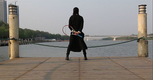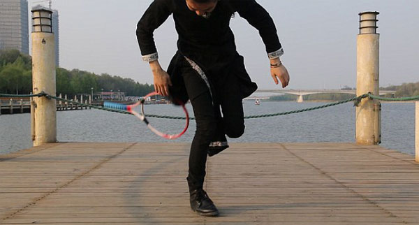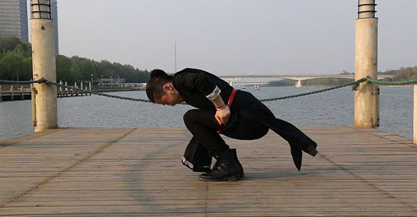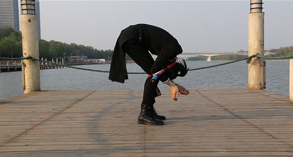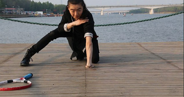 검은 복장 차림의 무술전문가 왕뢰(Wanglei). 그는 곡예에 앞서 왼쪽 팔을 땅을 고정한 채 360도 몸을 회전하는 유연함을 선보입니다. 이어 그는 테니스라켓 속으로 양다리를 통과시킨 뒤, 고개를 넣어 자연스럽게 라켓을 통과합니다. 그의 뛰어난 유연함이 그저 놀라울 따름입니다.