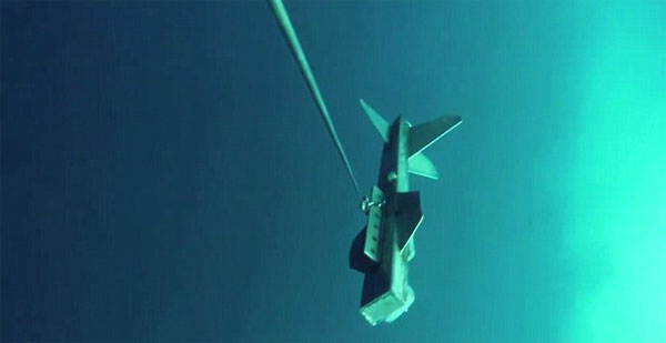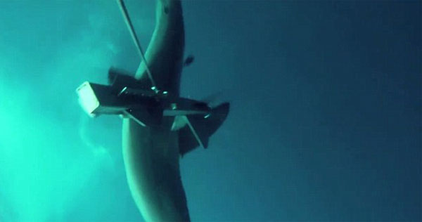 영상을 보면 수중 바다 깊숙이의 금속 수중 드론의 모습이 보인다. 곧이어 거대한 백상아리가 나타나 하얀 이빨을 드러내며 드론을 공격한다. 먹이가 아님을 알아챈 백상아리가 급히 자리를 뜬다. 무시무시한 백상아리 이빨 공격에도 드론은 무사해 보인다.