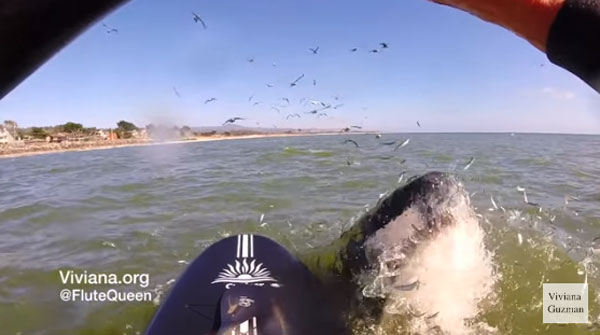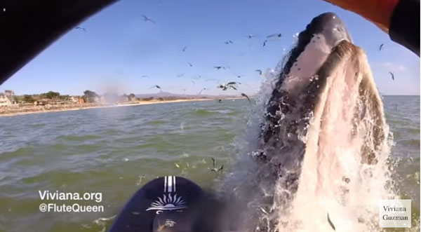 20일(현지시간) 미국 뉴욕데일리뉴스는 최근 캘리포니아주 하프 문 베이에서 패들보드를 즐기던 비비안나 구스만(Viviana Guzman)이란 이름의 여성이 수면으로 올라온 혹등고래에 놀라는 모습을 기사와 함께 소개했다.