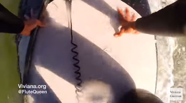 영상에는 패들보드를 타고 플루트를 연주하고 있는 구스만과 수면 위에 떠 있는 갈매기떼의 모습이 보인다. 잠시 뒤, 구스만이 타고 있던 검은색 패들보드 바로 옆으로 거대한 혹등고래에 솟아오르고 이에 구스만이 비명을 지르며 화들짝 놀란다.