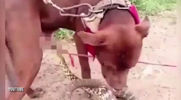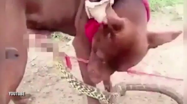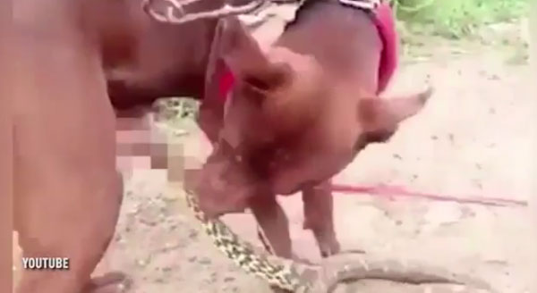 영상을 보면, 뱀에게 성기를 물린 개가 고통스러워하는 모습이 보인다. 개는 자신의 성기를 문 뱀을 떼어내려하지만 뱀은 놓아주지 않는다.