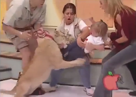 예상치 못한 사자의 공격에 어린 딸을 안고 있던 아기 엄마가 당황해하며 비명을 지른다. 소란스러워진 스튜디오의 분위기에 더욱 흥분한 사자가 아기를 앞발로 끌어당기며 물어뜯으려하자 아기 엄마는 거세게 딸의 양팔을 잡아당긴다. 여성 사육사가 서둘러 아기 엄마에게 침착하라고 말을 건넨 다음, 사자를 진정시키고 남성 사육사가 가세해 사자를 떼어낸다. 여성 사육사가 멋쩍은 표정을 지으며 사자 공격에 놀란 아기와 엄마를 안으며 미안함을 전한다.