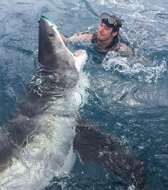 사진에는 해상에서 만난 바닷 속 최상위 포식자인 거대 백상아리의 코를 문지르는 다이버의 모습이 포착돼 있다. 뾰족한 이빨을 드러낸 백상아리가 얌전한 상태로 다이버의 손길을 느끼며 애완동물처럼 가만히 있다. 이는 상어를 ‘긴장성 부동’(tonic immobility)으로 빠지게 하는 모습이다.