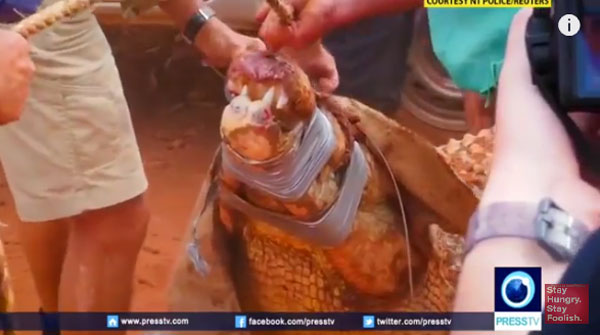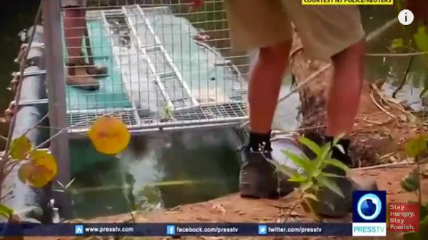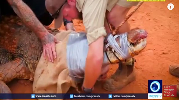 공개된 영상에는 덫에 잡힌 악어를 물 밖으로 끌어내는 경찰과 공원 관리원들의 모습이 담겨 있다. 곧이어 밧줄에 입이 꽁꽁 묶인 채 악어가 뭍으로 끌려 나오자 4.3m의 공룡 같은 육중한 몸체가 드러난다.