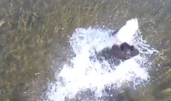 자신을 쫓아다니는 드론이 성가신 듯 악어는 기회를 엿보다 큰 입을 벌리며 점프해 드론을 공격합니다. 하지만 생각보다 드론은 높이 떠 있어 무사하네요. 악어의 풍덩거림에 물속은 시야가 흘려집니다. 악어가 급히 자리를 뜨네요.
