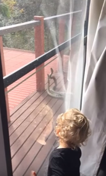 뱀들의 서로 뒤엉켜 싸우는 모습을 현관 유리 앞에서 어린아이가 감상 중이다. 집에서 자주 접하는 모습이라 아이도 특별하게 놀라지 않은 채 뱀들의 싸움을 엄마와 함께 지켜본다.