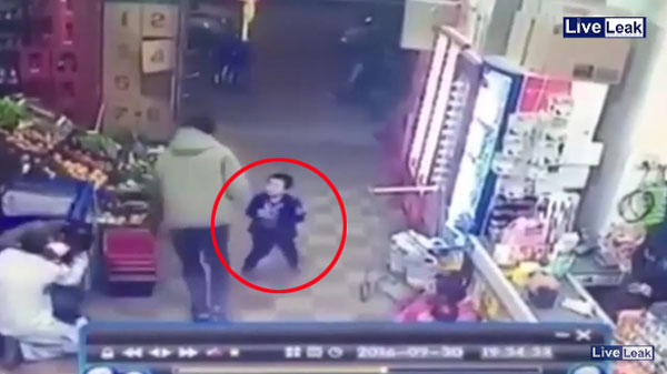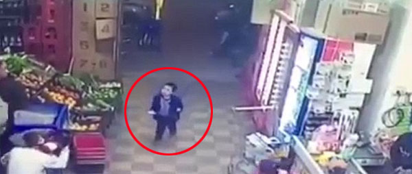 슈퍼마켓에서 강도짓하는 무장강도들 사이로 겁없이 걸어들어오는 유아의 모습이 CCTV에 포착돼 화제다.