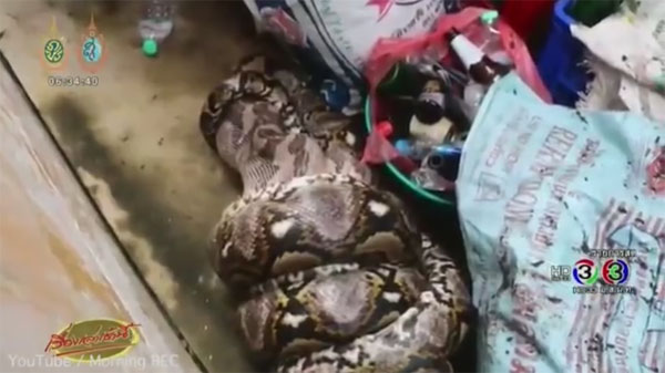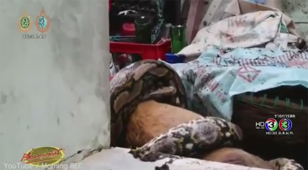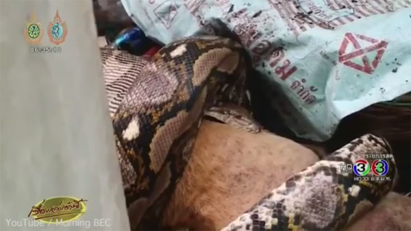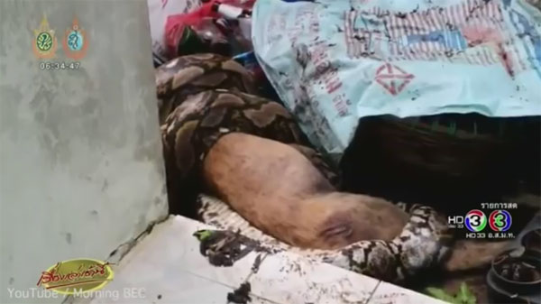 7일(현지시간) 영국 데일리메일에 따르면 최근 태국 파툽타니에 거주하는 클롬판 쿠완(Klomphan Khiewwan·21)의 집에 6m 비단뱀이 침입, 애완견을 잡아먹은 사건이 발생했다.