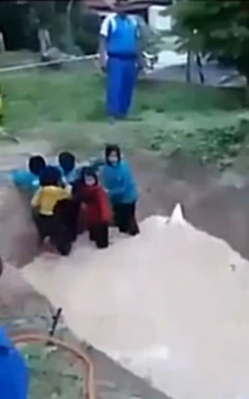 영상에는 교사들이 지켜보는 가운데 훈련용 물웅덩이에서 빠진 여학생들의 모습이 보입니다. 잔뜩 겁을 먹은 학생들은 급히 땅 위로 올라가려 애씁니다. 교사들은 학생들이 땅 위로 올라오는 것을 방해하기 위해 물을 뿌립니다.