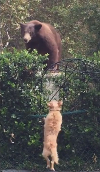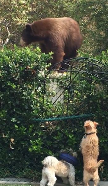 ‘하룻강아지 곰 무서울 줄 모른다’는 말이 생각날 정도로 두 마리의 애완견은 육중한 회색곰을 향해 끊임없이 짖습니다. 순한 얼굴의 곰은 견공들이 귀여운 듯 한 번 내려다본 뒤 그냥 숲으로 돌아갑니다.