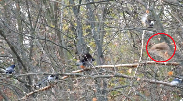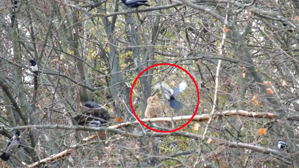 1분가량의 영상에는 나뭇가지 위에서 떼로 모여 새끼 올빼미를 향해 위협적인 소리를 내는 새떼들의 모습이 담겨 있다. 까마귀떼와 까치 몇몇 마리는 홀로 나뭇가지에 앉아 있는 올빼미를 부리로 쪼며 괴롭힌다.