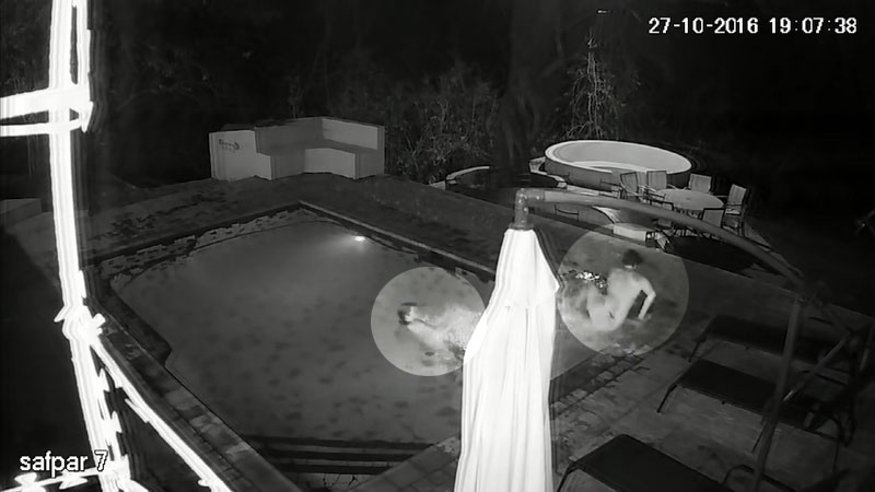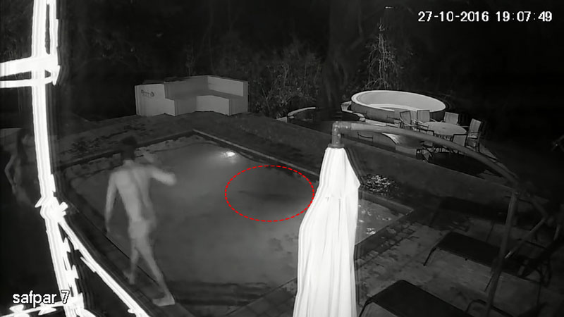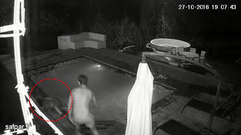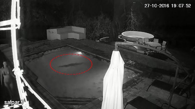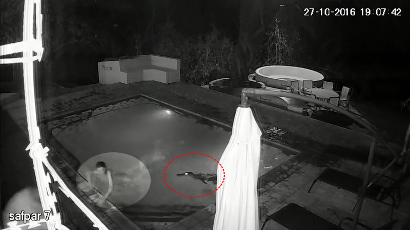 당시 늦은 밤에는 풀에서 젊은 남녀가 수영 중이었으며 CCTV 화면 한편으로 슬며시 접근하는 악어의 모습이 포착됐다.