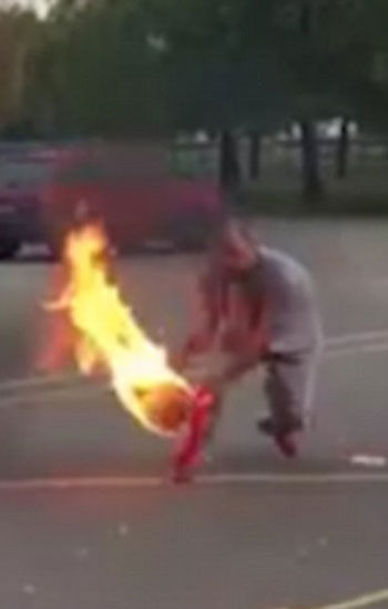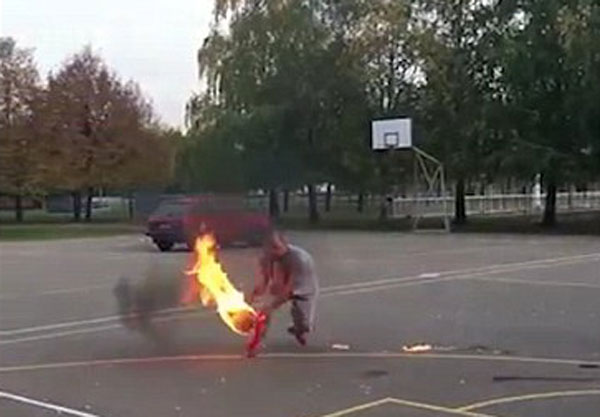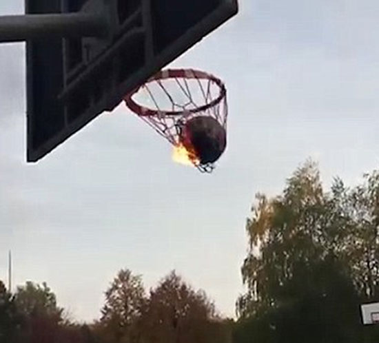 농구공에 불을 붙인 채 드리블하는 남성의 영상이 논란이 되고 있다.