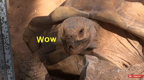 영상에는 우리 안의 거북이가 관람객에게 다가와 ‘와우 와우’를 연발합니다. 사람처럼 소리 내는 거북이의 모습에 관람객들이 신기해합니다.