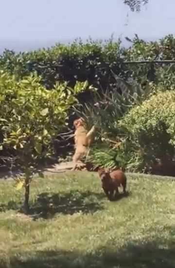1일 유튜브에 게재된 영상에는 집 뜰에서 분주하게 움직이는 애완견 두 마리의 모습이 담겨 있다.