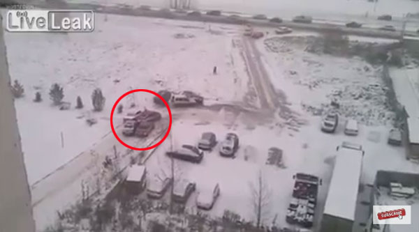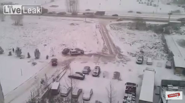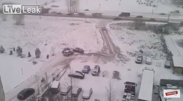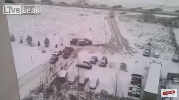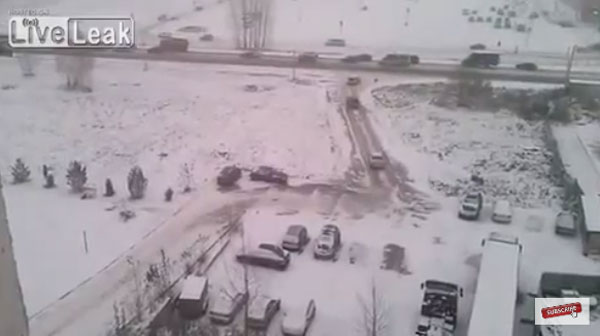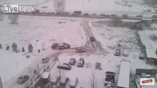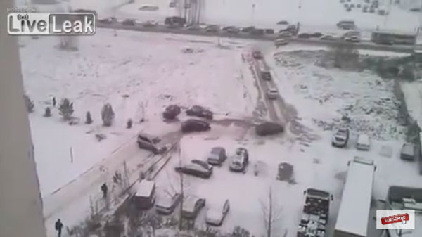언덕에서 내려오던 차량은 빙판길에 미끄러져 추돌사고를 내고 맙니다. 운 좋게 무사히 언덕을 내려온 차량은 무사히 큰길로 진입합니다. 하지만 잠시 뒤, 차량 한 대가 미끄러지면서 뒤이어 오던 차량 3대와 연쇄추돌을 하네요. 모든 것이 꽁꽁 얼어붙는 러시아의 겨울엔 차는 집에 놓고 다녀야 할 듯합니다.