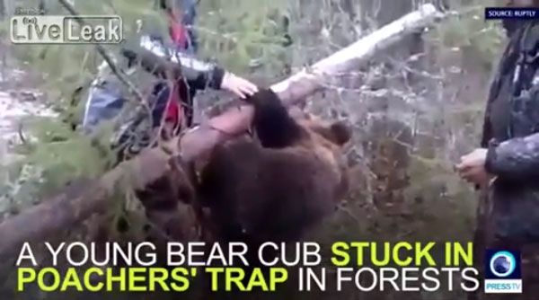 영상에는 벨스키 지역의 한 숲에서 밀렵꾼이 설치한 덫에 걸려 꼼짝달싹 못 하는 새끼 곰의 모습이 포착돼 있다. 사냥꾼들의 접근에 잔뜩 겁먹은 새끼 곰이 포효하며 도망치려 애쓴다.