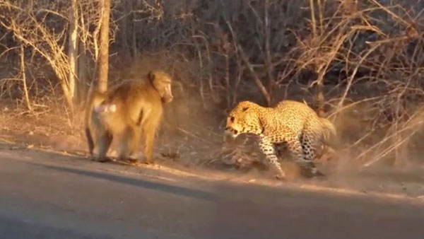 표범을 도망치게 만든 동물은 다름 아닌 개코원숭이. 강력한 턱과 뾰족한 송곳니를 가진 개코원숭이 우두머리 수컷은 표범도 두려워할 정도로 위험한 동물이라네요.