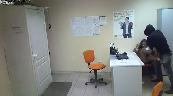 영상에는 지난 6월 러시아 툴라 주 슈초키노의 한 소액 대출업 사무실에 후드티 차림에 선글라스와 마스크를 한 남성이 들어옵니다. 남성은 다짜고짜 여성에게 다가와 강도로 돌변해 폭력을 가합니다. 여성은 폭행하는 강도에 맞서 발차기를 하며 싸웁니다.