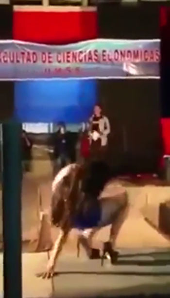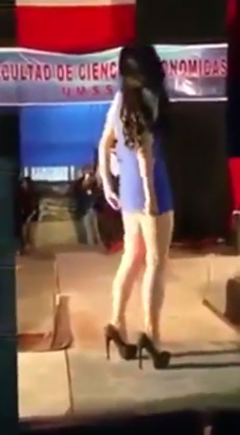 영상에는 무대 위에 파란색 짧은 원피스 차림의 여대생이 보입니다. 신나는 노래에 맞춰 춤을 추는 그녀. 잠시 뒤, 무대 중앙으로 런웨이하며 이동하는 그녀는 너무나 높은 하이힐 굽에 스텝이 꼬여 주저앉는다.