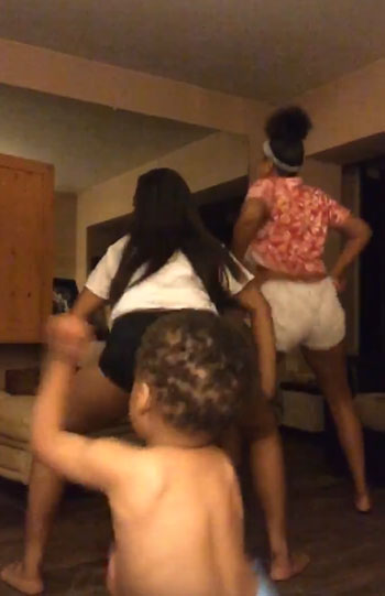 카메라 앞에선 이모 앨리스 브렌트(Alyce Brent)과 테일러 모리스(Taylor Morris). 음악이 시작되자 두 젊은 여성은 트워킹을 추기 시작한다. 트워킹(twerking)은 다리를 벌려 몸을 낮춘 상태에서 빠른 골반 바운스를 보이는 성적인 춤.