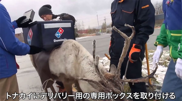 공개한 영상에는 지난 11월 초 홋카이도 배달통합연구센터의 도움을 받아 GPS 추적기가 달린 순록이 피자 배달 훈련을 받고 있는 모습이 담겨 있다. 홋카이도의 혹독한 겨울 날씨로 인해 추위에 강한 순록들을 배달원으로 기용한 것이다.