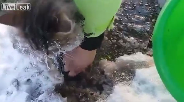 고양이의 처지를 딱히 여긴 사람들은 뜨거운 물을 가지고 와 얼어붙은 고양이의 발에 쏟아붓습니다. 여성은 언 강물 표면에서 떼어낸 고양이를 담요로 감싼 뒤 따뜻하게 안아줍니다.