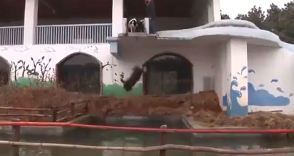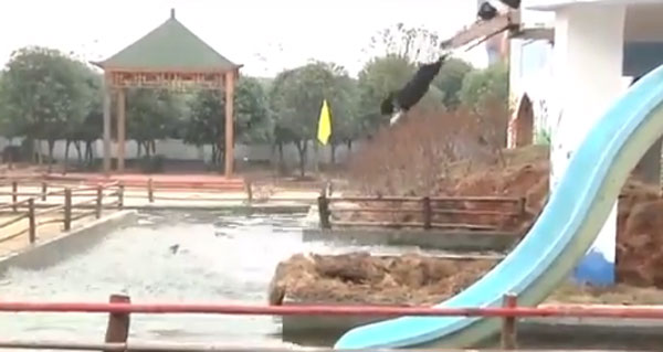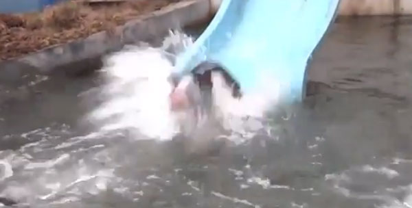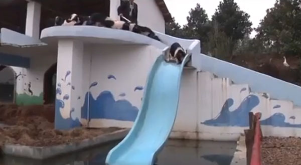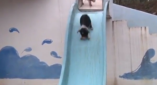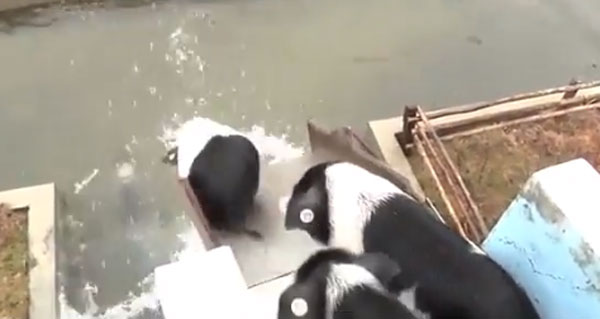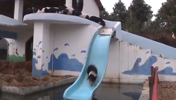 영상에는 2층에 설치된 미끄럼틀을 타고 줄줄이 물로 내려오는 돼지들의 모습과 2층 높이의 다이빙대에서 돼지들이 물로 점프하는 모습이 담겨 있다. 남성은 호루라기를 불며 다이빙대에 선 돼지들을 뛰어내리게 유도한다.