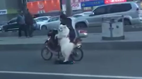 영상에는 중국의 도로에서 스쿠터를 타고 가는 주인 옆에서 전동 킥보드를 타고 질주하는 반려견의 모습이 보입니다. 반려견은 두 발로 서서 앞발로는 킥보드 손잡이를 잡은 채 주인과 나란히 도로를 주행합니다.