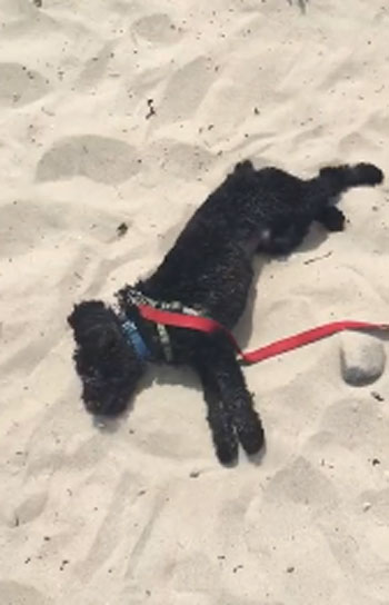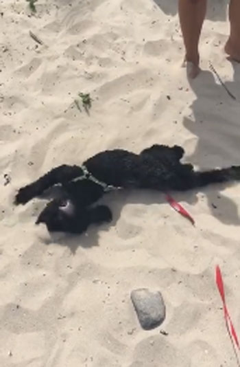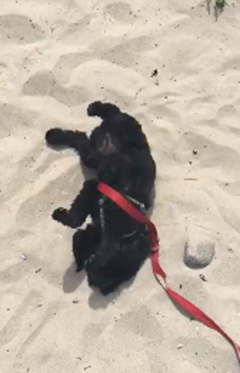 새끼 아리는 해변 모래사장의 모래가 고운 듯 온몸을 비벼대며 자연을 만끽합니다. 평온한 표정을 짓는 아리의 모습이 한편으론 측은해 보입니다.