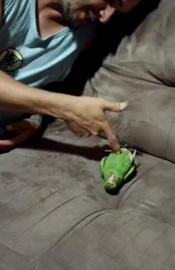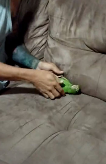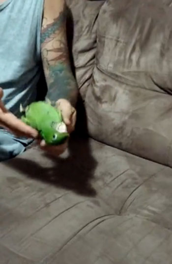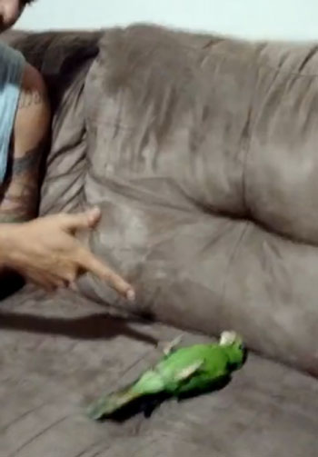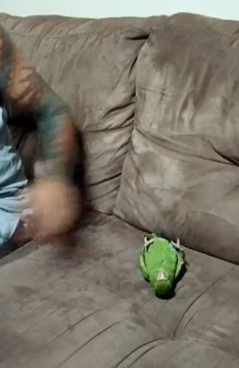 주인이 손가락으로 총 모양을 만들며 ‘빵’ 소리를 내자 앵무새는 소파 위에 쓰러지며 죽은 척합니다. 꼼짝없이 누워있는 앵무새의 모습이 신기하기만 합니다. 아마도 이 앵무새는 세상에서 가장 죽는 연기를 잘하는 새일 거 같네요.