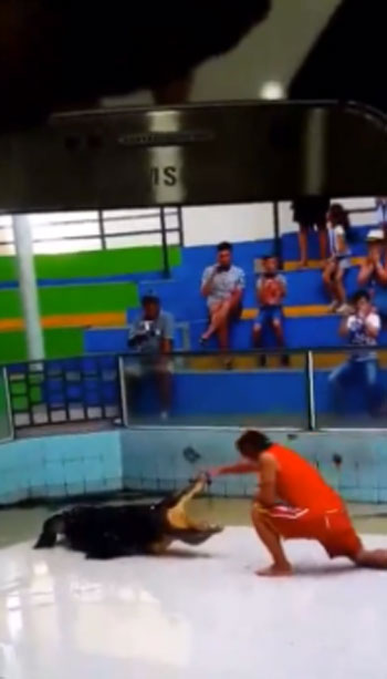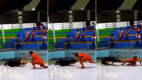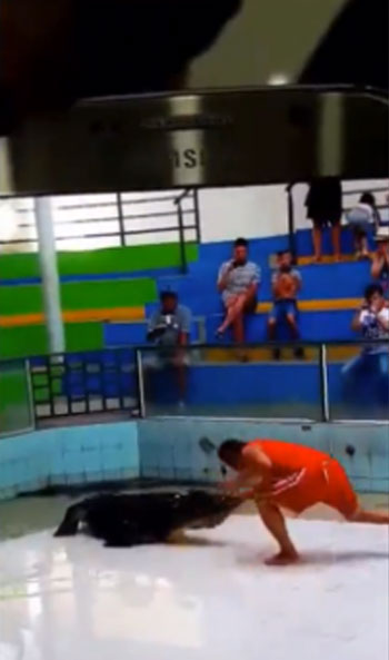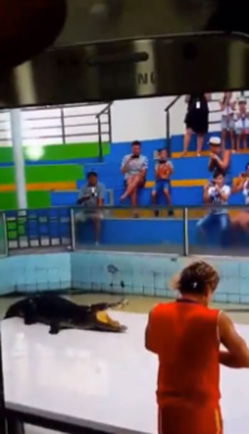 입을 크게 벌리고 있는 악어. 조련사가 악어의 입속에 속을 넣는 순간, 악어는 조련사의 손목을 뭅니다. 예상치 못한 악어의 행동에 당황한 조련사가 악어와 함께 몸을 회전하며 손을 빼냅니다. 악어에게서 멀리 떨어진 조련사가 아픈 듯 손목을 어루만집니다. 조련사가 무사하길 빕니다.
