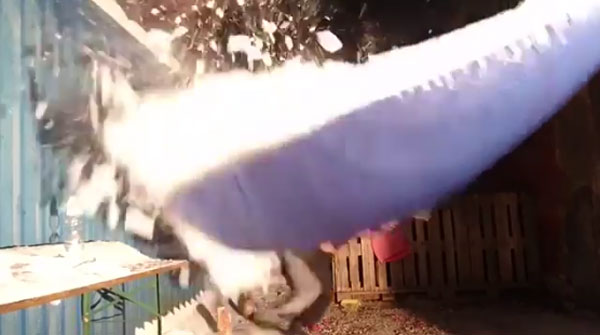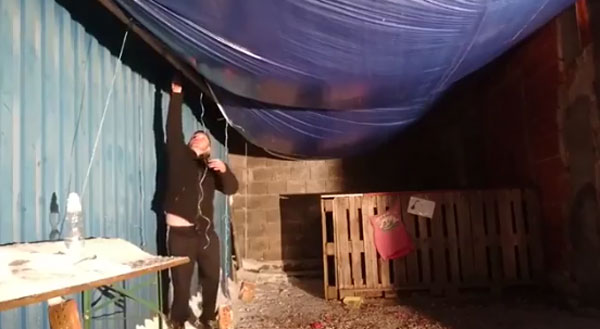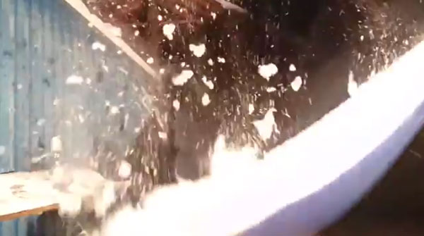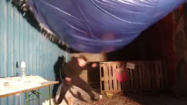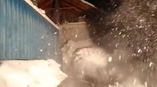 눈을 막기 위해 임시로 쳐 놓은 비닐천막 위로 폭설로 인한 눈이 한가득 쌓여 있습니다. 모퉁이 쪽 매어 놓은 줄 한 개를 남성이 칼로 자릅니다. 곧이어 중간 쪽 두 번째 줄에 칼을 대는 순간 비닐 천막 위 눈들이 쏟아지며 남성을 덮칩니다. 남성이 재빨리 몸을 숙이면서 피하려 하지만 쏟아지는 눈은 그보다 더 빠를 뿐이네요. 과연 남성은 무사할까요?