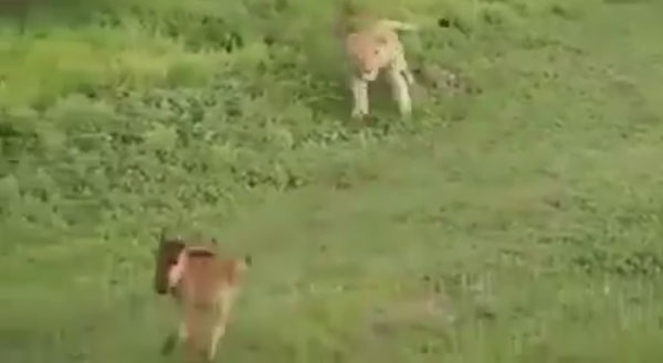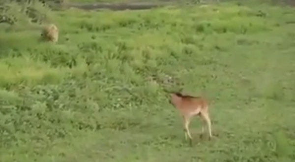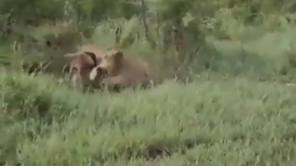잠시 뒤, 둘의 사이를 질투라도 하듯 매복 중인 또 다른 사자가 공격해온다. 놀랍게도 암사자는 격렬하게 막아서며 누를 지키기 위해 싸운다. 상황이 여의치 않자 사자는 새끼 누를 입에 물고 뒤로 물러서며 싸움은 끝이 난다.