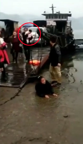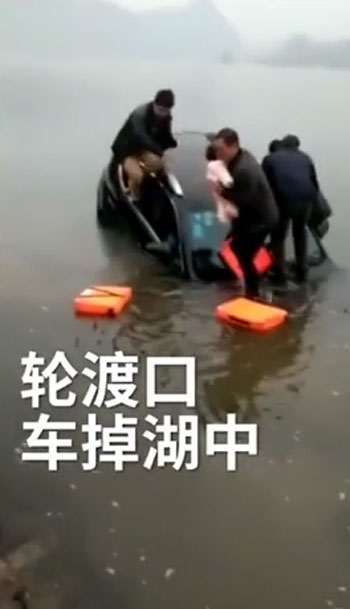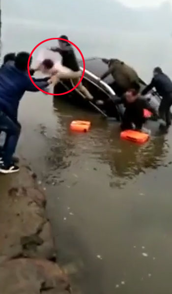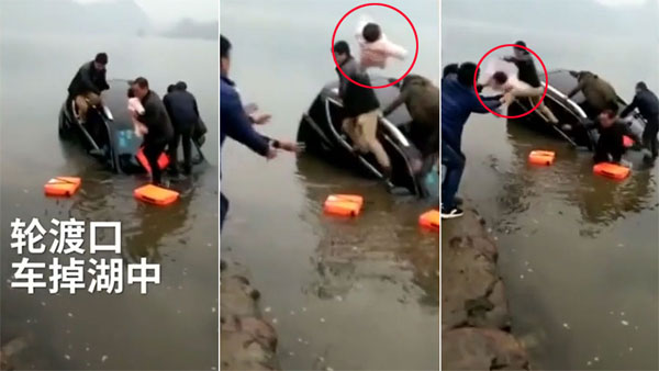 영상에는 점점 수면 아래로 가라앉는 차량에서 탈출하려는 가족들의 모습이 보인다. 어린 딸을 안은 채 차량에서 빠져나온 남성. 아빠로 추정되는 이 남성은 차가 거의 수면 아래로 가라앉자 뭍에 있는 한 남성에게 아기를 던진다. 부둣가에 있던 남성이 어렵사리 아기를 무사히 받아 안는다.