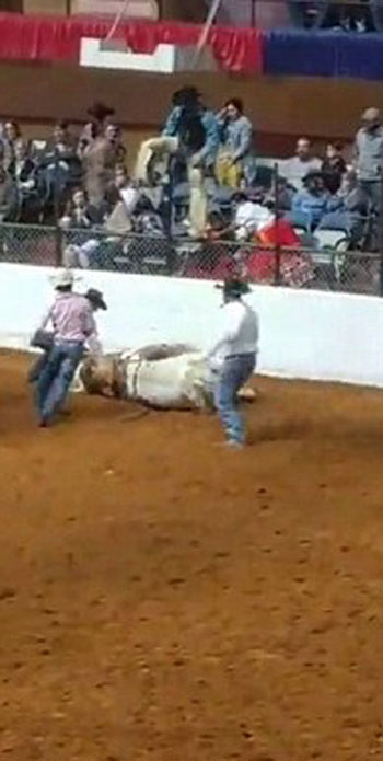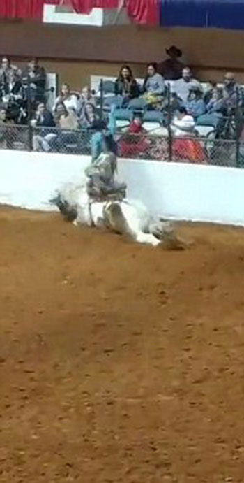 비운의 주인공은 ‘인내의 보물’이란 이름의 9살짜리 마(馬)로 로데오 관중들 앞에서 펜스 벽에 머리를 부딪혀 쓰러졌다. 안장에 탔던 라이더는 말의 행동에 놀라 펜스 위로 서둘러 피하지만 말은 척수손상으로 그 자리에서 죽음을 맞이했다.