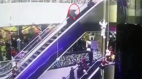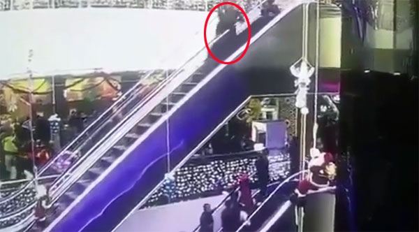 쇼핑몰 CCTV에 포착된 영상에는 긴 드레스 차림에 오른팔에 아기를 안은 채 에스컬레이터를 내려오는 젊은 여성의 모습이 보인다. 옷자락이 에스컬레이터 계단 사이에 끼이면서 몸이 휘청대며 중심을 잃은 여성이 안고 있는 아기를 놓친다. 여성의 품을 떠난 아기는 4층 높이의 땅바닥으로 떨어지며 현장에서 즉사한다.