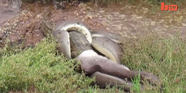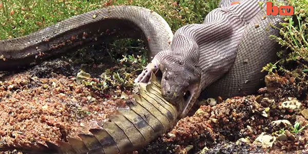 몸길이가 3m에 이르는 뱀은 자신보다 몸집이 작은 악어와 5시간을 쉬지 않고 사투를 벌이다가 마침내 악어를 통째로 삼켜버리고 만다. 뱀이 악어를 삼키는데 불과 15분 정도밖에 걸리지 않은 것으로 알려졌다.