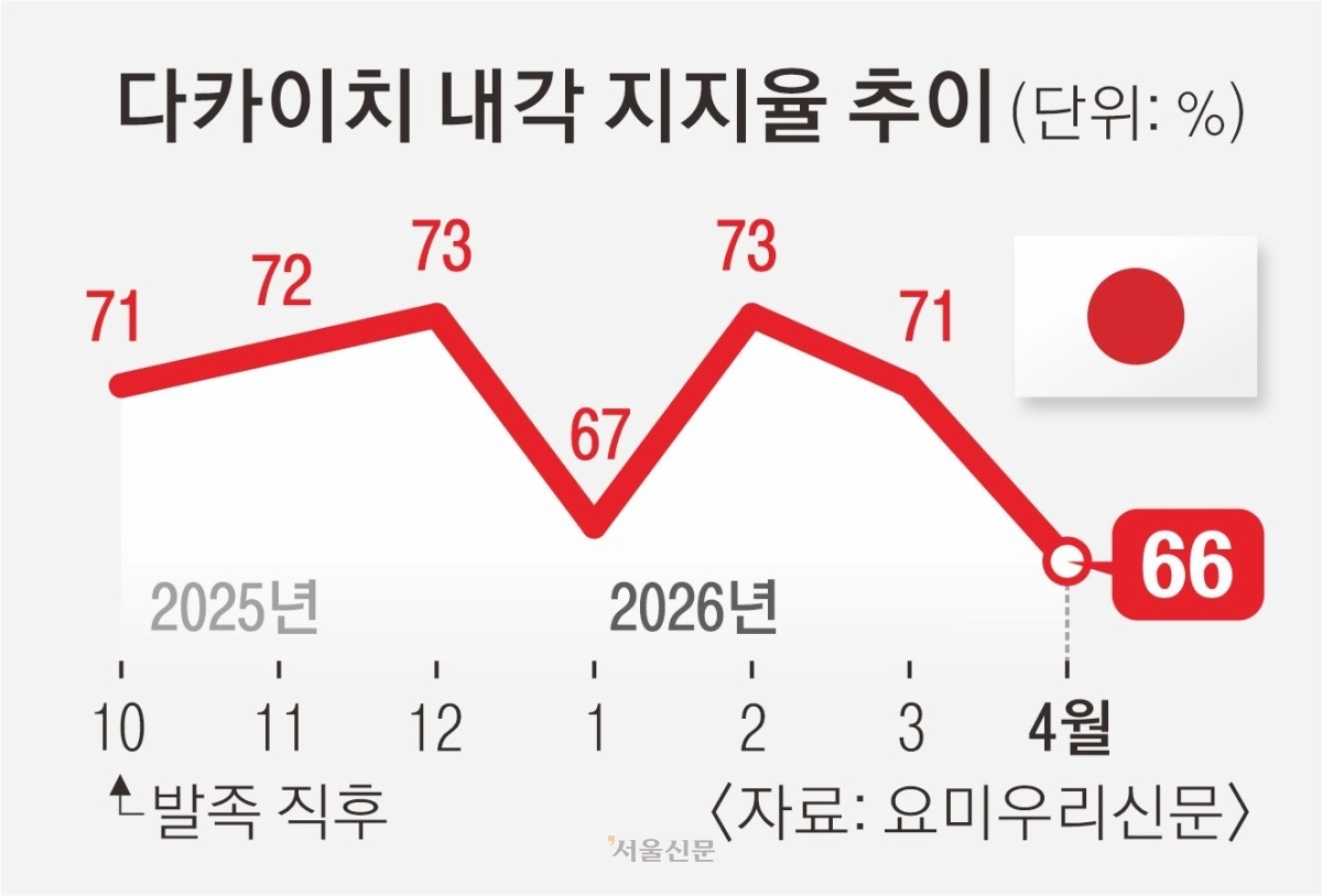 중동 정세 불안, 공급망 리스크 등 각종 복합 위기 속에서도 지지율은 버텨주고 있지만, 다카이치식 ‘관저 주도’ 방식에 대한 당내 불만은 향후 변수로 지목된다.