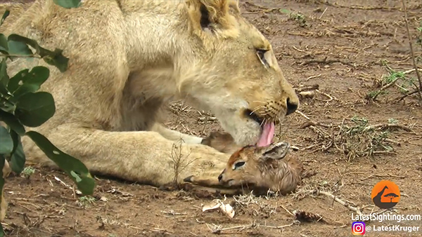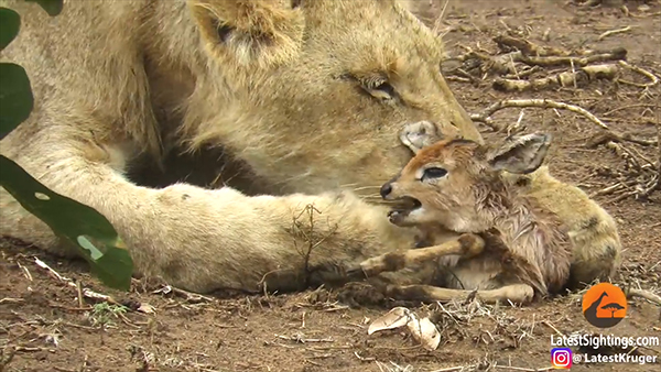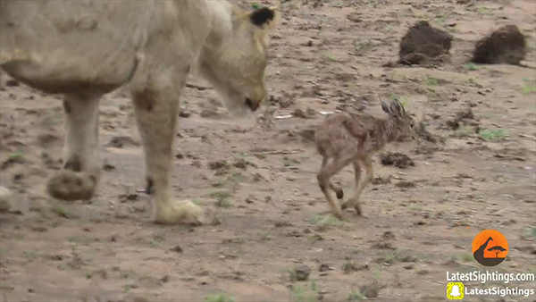 공개된 영상에는 암사자 한 마리가 새끼 영양을 앞에 놓은 채 엎드려 있다. 사자가 어린 영양의 몸에 입을 가져다 대면 이 작은 녀석은 낑낑대며 운다. 금방이라도 영양을 먹어치울 듯 굶주린 암사자는 사냥감이 울 때마다 반복적으로 머뭇거린다. 그렇게 녀석은 한참 동안 발 앞에 있는 새끼를 입으로 물었다 내려놨다 하더니 결국 영양과 함께 카메라가 없는 방향으로 이동한다.
