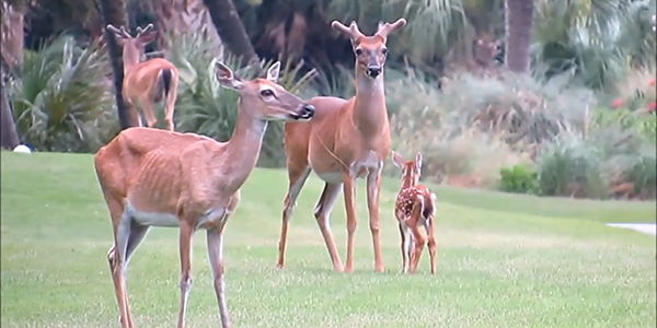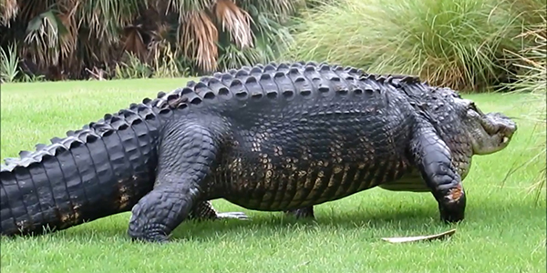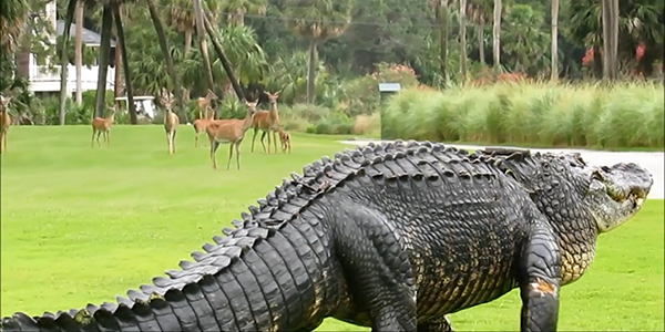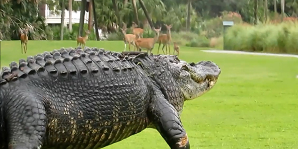 영상을 보면, 악어 한 마리가 골프장을 가로질러 성큼성큼 이동하는 모습이 담겨 있다. 그런 녀석의 위풍당당한 모습이 놀라운 듯 주변에 있는 사슴들이 두 눈 크게 뜨고 바라본다.