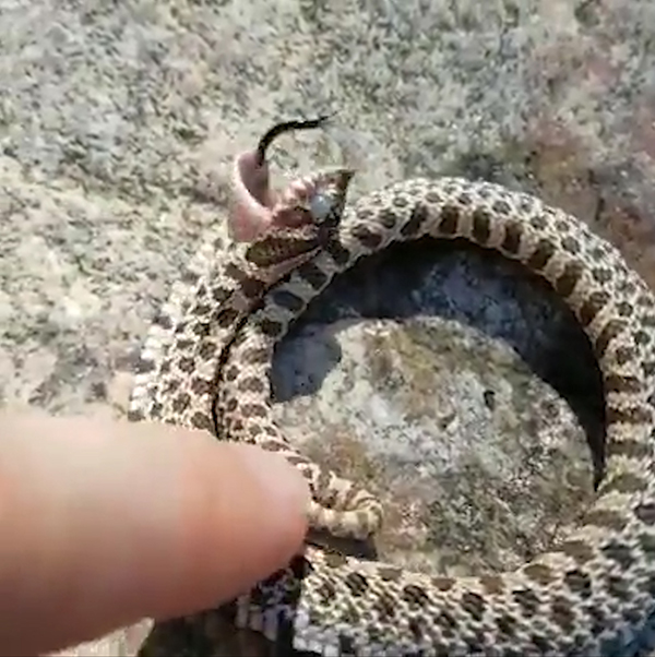 영상 속 뱀은 사람의 손가락이 몸에 닫자마자 몸을 비틀어 감는다. 그리고 입을 벌리고 혀를 축 늘어뜨리며 죽은 ‘척’ 한다.