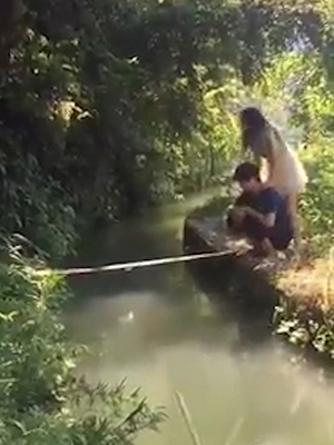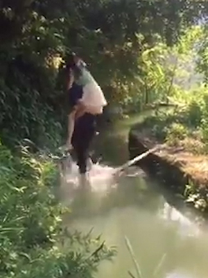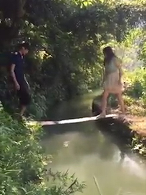 도랑 사이에 놓인 나무다리를 건너던 커플이 물에 빠지는 모습이 공개돼 누리꾼들에게 웃음을 주고 있다.