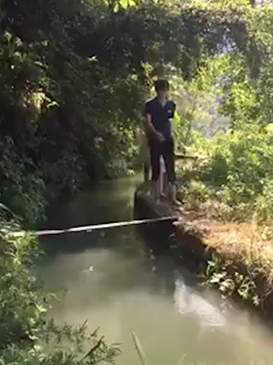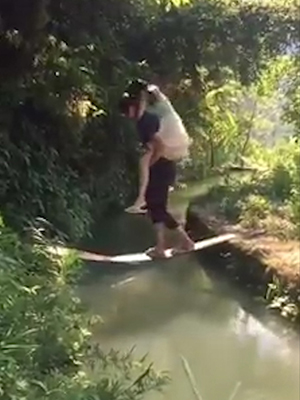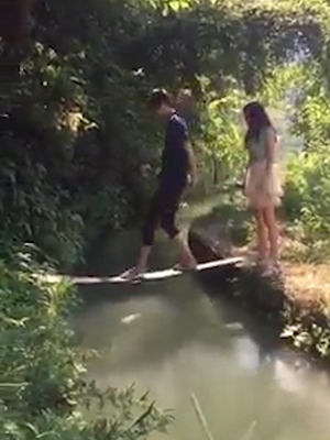 영상을 보면, 도랑 사이에 얇은 나무다리가 놓여 있다. 손을 잡고 다정하게 등장한 커플 중 남성이 먼저 다리를 건넌다. 허술해 보이는 다리 앞에서 여성이 건너기를 주저하자 남성이 되돌아와 여성을 업고 다리를 건너기 시작한다.