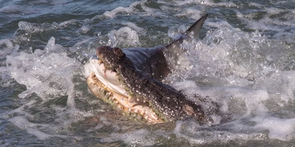 이들은 악어 한 마리가 낚싯배를 쫓아오자 생선 조각 하나를 던져주기로 했다. 그런데 생선조각을 악어에게 던지는 순간, 놀라운 광경이 펼쳐졌다. 낚싯배 주위를 돌던 상어가 생선조각을 낚아채려 한 것이다. 하지만 악어는 순식간에 상어를 제압하고 만다. 그리고는 생선조각 대신 상어를 입에 문 채 어디론가 사라진다.
